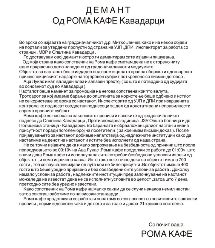 Kaфе „Рома“ од Кавадарци каде викендот настапи Аца Лукас и беше прекинат поради неколку пропусти во организацијата излезе со соопштение во кое нагласуваат дека кај нив нема никаква вина за она што се случило.